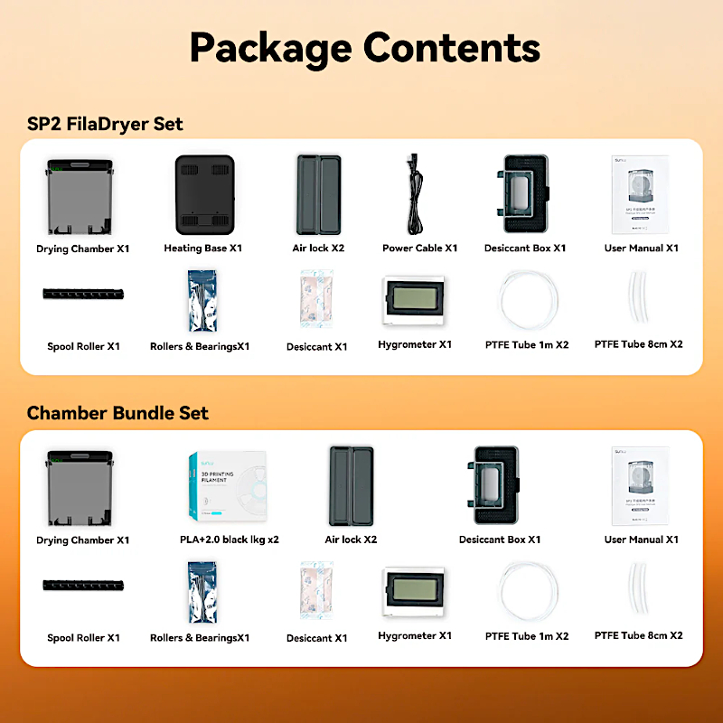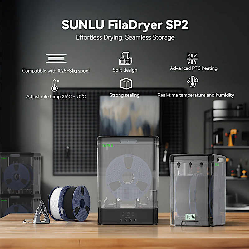 Storage Box SP2 від Sunlu - це набір, що включає герметичний бокс і два рулони філаменту PLA+2.0 чорного кольору по 1 кг кожен. Бокс дозволяє зберігати матеріал сухим з контролем вологості, що запобігає погіршенню якості 3D друку - проблем, пов’язаних із вологістю, як-от stringing, погане зчеплення шарів чи засмічення сопла.
