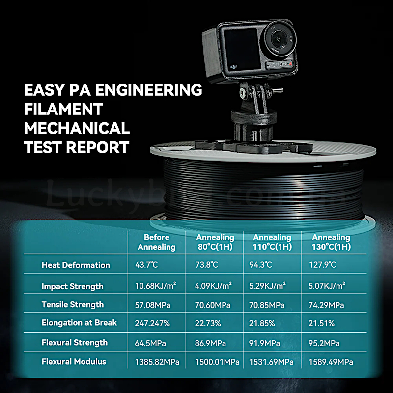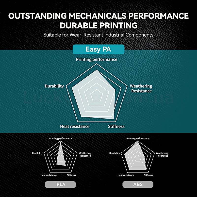 Філамент постачається у вакуумній упаковці з осушувачем та має підвищену стійкість до вологи під час друку і зберігання, що дозволяє отримувати 100% безбульбашковий друк з якісною адгезією шарів. Висока ударостійкість і міцність роблять Easy PA ідеальним для функціональних, інженерних та промислових деталей.