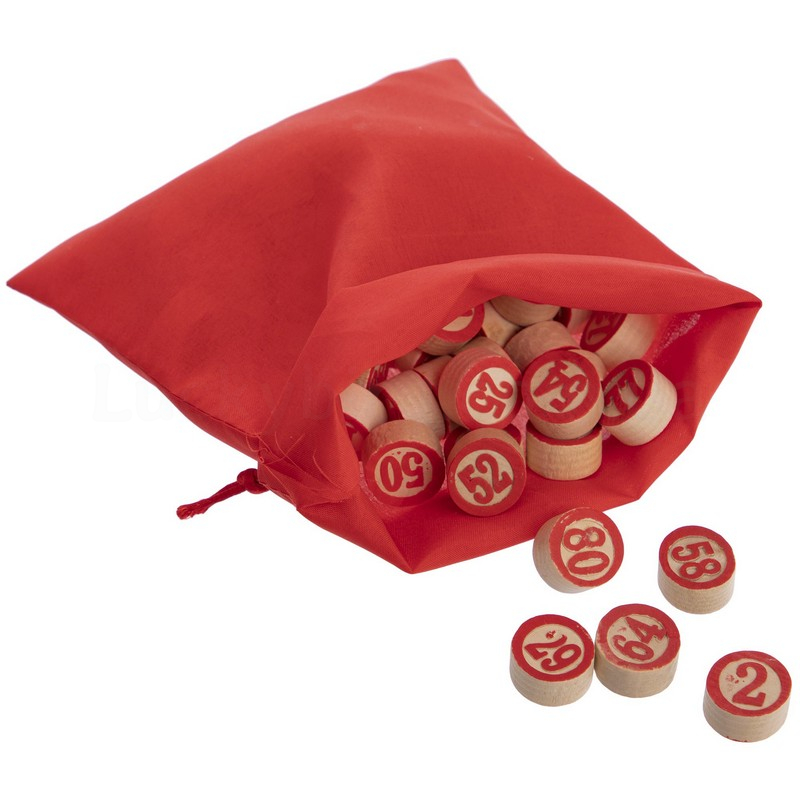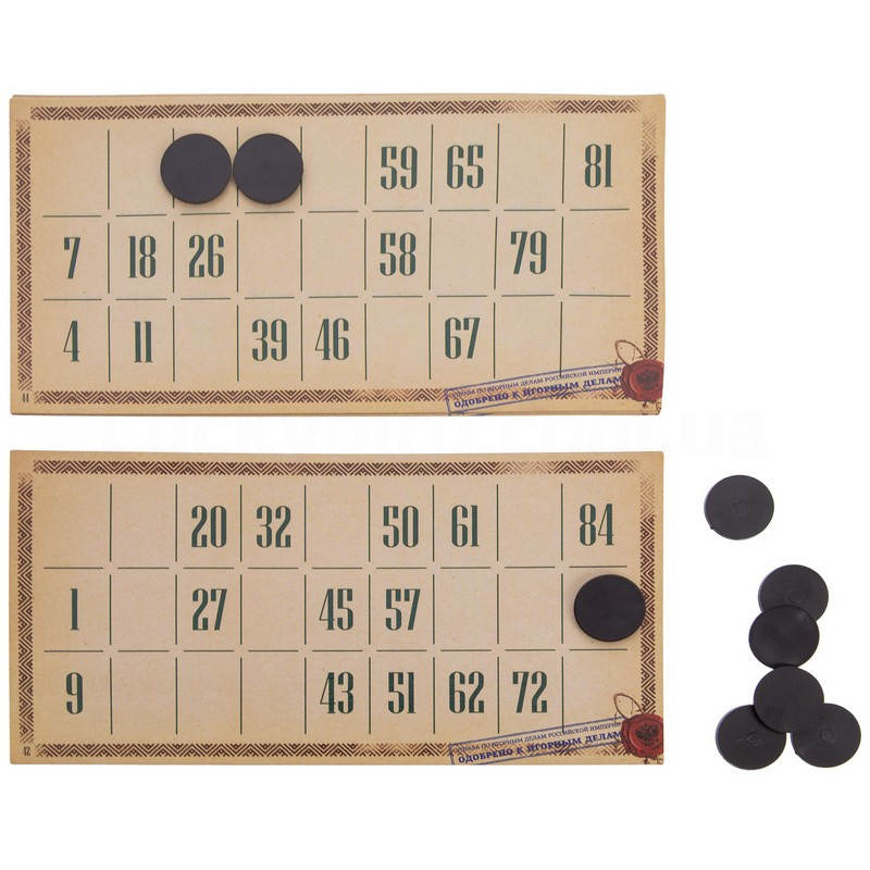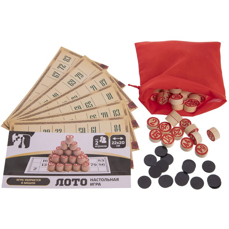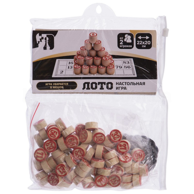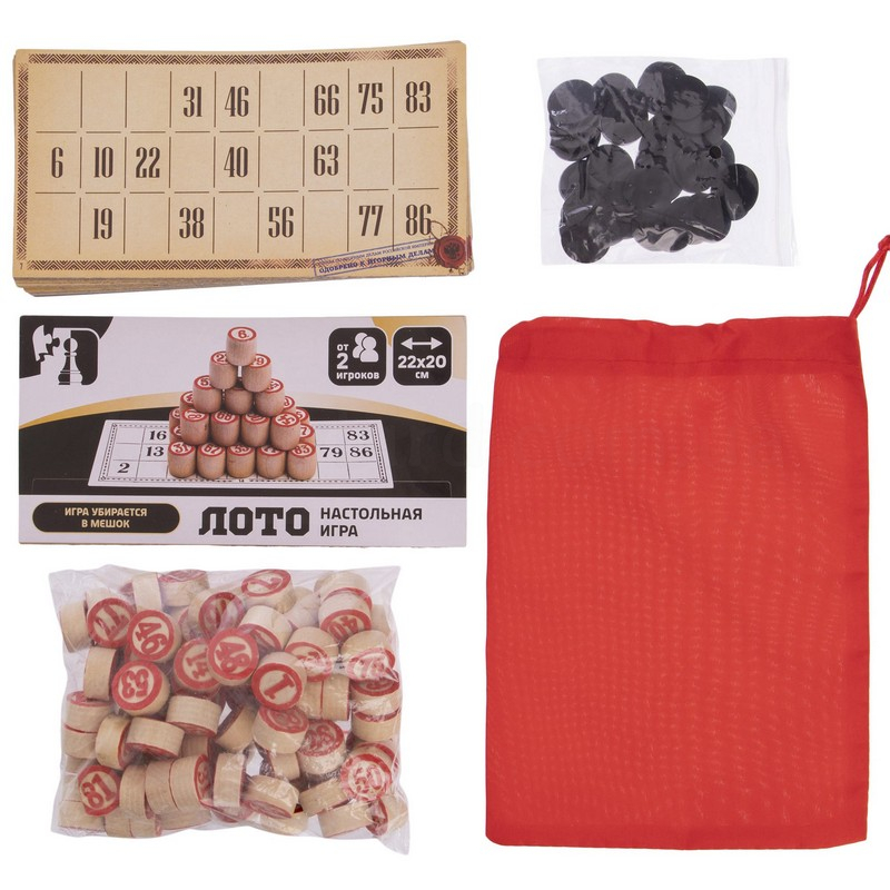 У комплект входить набір бочонок, пронумерованих від 1 до 90, які виготовлені з твердої, належним чином висушеної деревини, що гарантує їм довговічність – вони витримують серйозний механічний вплив і не розсихаються з часом. Також до нього включені спеціальні картки з ламінованого картону та пластикові фішки, а також сукняний мішечок, в який складають бочонки під час гри. Все це акуратно запаковано у прозорий чохол, який захищає елементи лото від пилу.
